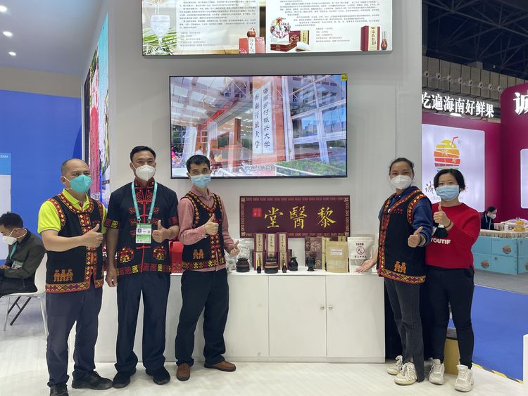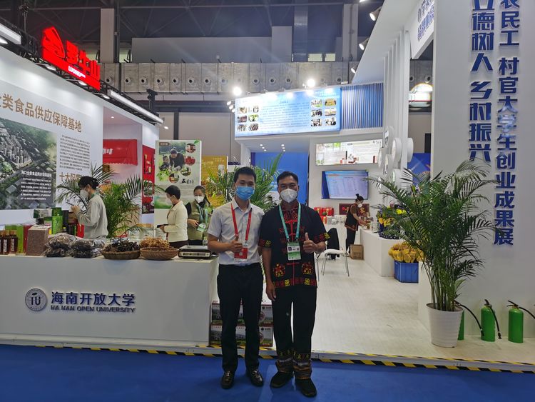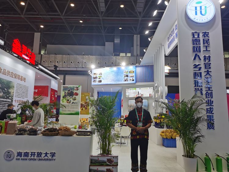 海南开放大学三亚学院行政专科院麦永良、行政管理本科麦剑萍两位同学携带黎王沉香精油、百香果等近10种农产品参展。